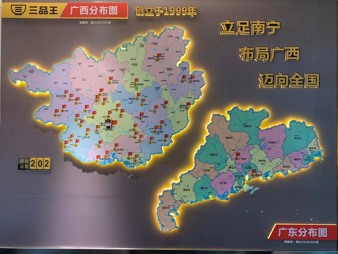 1999年7月21日,第一家“三品王”在南宁市桃源路开业。如今,208家门店遍布广西、广东。