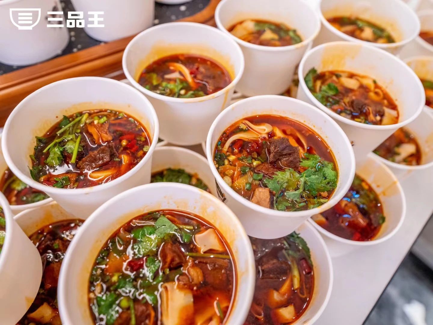 三品王聚焦原汤牛肉粉,所用牛肉全部采用新西兰等国的进口牛肉,用一斤牛肉熬出6斤汤的黄金比例做出的原汤,原汁原味,坚持不浓缩不兑水,成就了品牌超级口号“吃三品王,把汤喝光”。