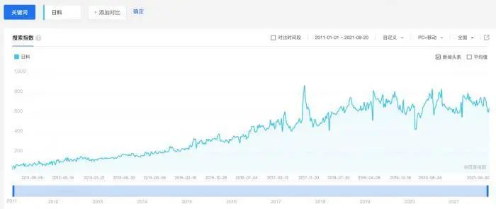 去年疫情初期,日本和民集团因为疫情及其它原因宣布全面退出中国内地市场。据中商情报调查数据显示,2020年尽管受到了疫情的影响,中国餐饮服务市场规模略微收缩到了39527亿元,但随后再次迅速回升,中国餐饮市场潜力巨大。而随着消费水平的升级,再加上产业链供应链的不断完善,中国市场持续吸引着海外餐饮品牌进驻和加大在华投资。在各类细分餐饮品类中,主打健康、鲜味的日料在年轻人的餐饮选择中一直人气高涨。据百度指数搜索显示,自2016年中旬开始,以“日料”为关键词的搜索已经开始呈现波动上升的趋势。