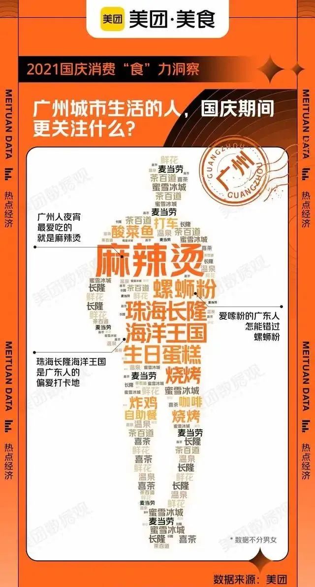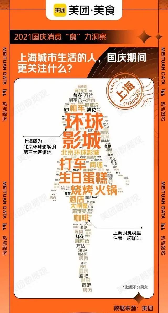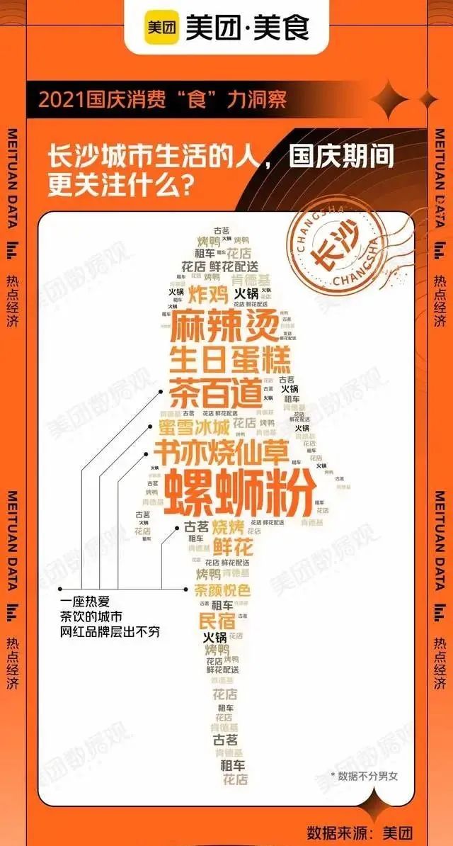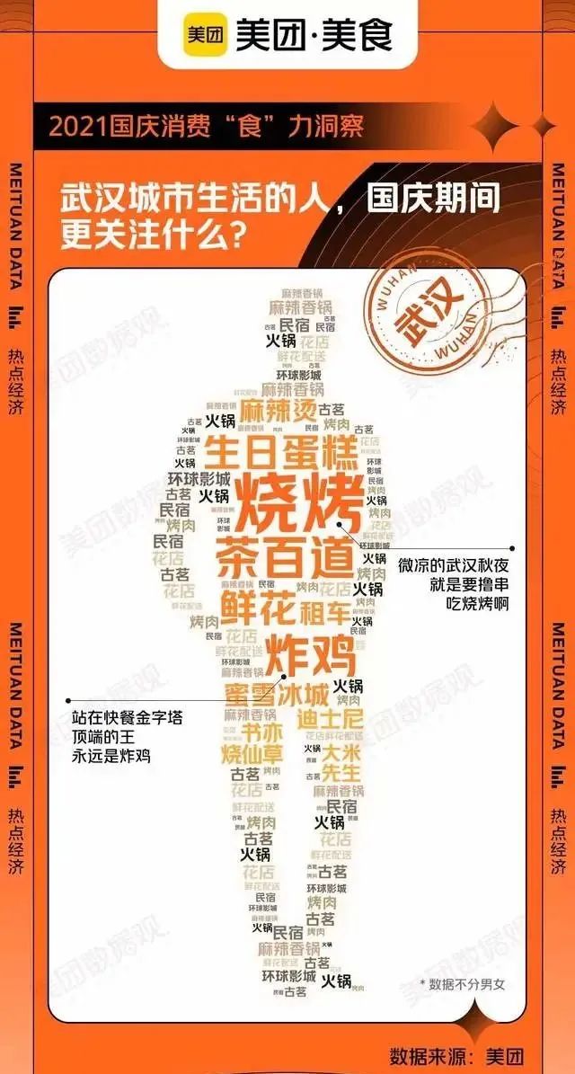 10月6日,美团发布《2021年国庆黄金周消费趋势报告》。报告显示省内游是今年国庆期间人们首选的旅游过节方式,全国异地消费用户占比22.4%,本地消费用户占比77.6%。随着国内疫情防控形势好转,国人消费信心进一步增强,十一黄金周消费经济持续回暖。综合美团各业务(餐饮、住宿、旅游、娱乐、出行等)的消费数据来看,今年国庆节期间的总体消费额同去年国庆节相比上涨29.5%,较2019年国庆节同比上涨51.6%。今年国庆期间,婚宴、生日宴会、亲朋好友聚餐等需求增加,促使全国餐饮消费一片红火。从美团上美食套餐、代金券等到店消费数据看,今年国庆期间通过美团App团购美食并到餐厅消费的订单量同比去年国庆增长49%。同时,大众点评App数据显示,国庆期间必吃榜餐厅订单量环比节前增长50.8%。美团数据显示,今年国庆长假美食消费热门TOP10城市为成都、北京、深圳、广州、武汉、重庆、上海、西安、杭州、长沙,其中长沙为今年新上榜城市。此外,南昌的美食相关消费订单量同比增长128%,在全国主要大城市中增幅最快,去年受疫情影响严重的武汉同比增速达到101%。从餐饮品类来看,火锅成为国庆期间订单量最高的正餐品类,并且仍然保持着较高的增速,较去年国庆增长29.9%。美团买菜数据显示,广州火锅订单量增长78%、深圳火锅订单量增长65%、上海火锅订单量增长34%、北京火锅订单量增长26%,其中国庆节假期前4天,广州消费金额最高的一笔订单就是购买火锅食材,总共花费了800元。