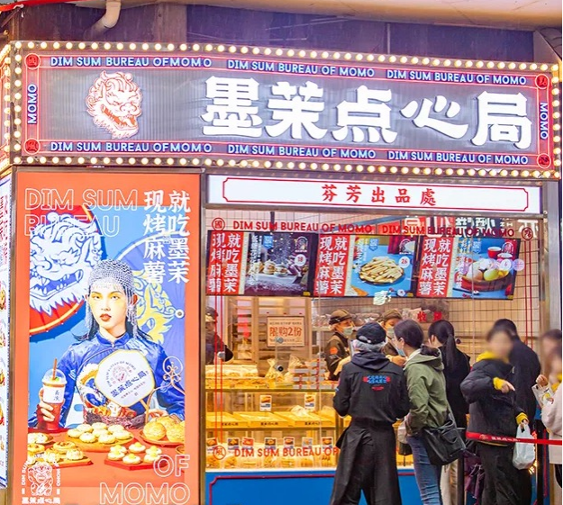 一方面,通过上述列举的6家品牌产品线,我们基本能够看出,他们贩售着融合中式糕点与西点风味技巧的一种新中式烘焙。在口感口味、尺寸造型、层次风味、健康营养、匠心工艺中,尽可能强调着一种新鲜力、颜值力与传承感。以更趋近于零嘴的形式与份量,有别于以往口味略显单一粗口的饼、糕、糖为主体的产品,来满足消费者的品尝与心理需求。比如墨茉点心局和虎头局聚焦的主力军麻薯,放大了软糯Q弹的口感;鲍师傅的肉松小贝,结合了酸甜的沙拉酱与厚厚一层海苔肉松,巧妙展现了丰富的层次。还有中式点心的网红产品盘挞,可叠加的多层次内馅,都以偏向于中点西做的混搭形式,提升了中式糕点的美味度。在如今的中点店中,我们不仅能看到经典的桃酥、绿豆糕,其实更招人喜欢的也就是这些差异化的产品了。最近,我也看到低糖低脂成为了大受欢迎的主流趋势,在墨茉点心局的菜单中就可以看到有专门开辟的低糖系列。无论从门店、包装、海报的设计上,这些品牌都巧妙贯穿了国潮的概念。比如在一众风格较为统一的极简风或欧式风、日式风中,墨茉点心局就以一个传统瑞兽狮子头作为Logo亮相,且设计得俏皮感十足,再以复古色红蓝为主色调,抢眼又有新意。包装上,也迎合着年轻人的审美。重点就是要让他们能够愿意拿在手上,愿意分享社交,从而轻松实现在小红书、抖音等拥有巨大流量的社交平台上,吸引更多的年轻一代消费者前来种草打卡。“口口相传”之下,自然能一跃成为瞩目的焦点。比如我前几天发的依茉朵家的冰面包,也是依靠着抖音的流量,成功跻身“网红”之列。大排长龙的队伍,更是进一步刺激着年轻消费者。说实话,如今新中式糕点的弱势也非常显而易见的。在我列出的6家门店之中,还是能够看出产品的大同小异。有麻薯、有桃酥、有绿豆糕、有泡芙、有盘挞……该有的每家店都有了。且各家都打着中点复兴的名头,输出着中点文化,同时也基本上借了国潮的东风,所以,本质上来说,各个新中式烘焙品牌之间,同质化依然明显。就像最初的网红鲍师傅,如今也报道着排队的人气大不如从前了。