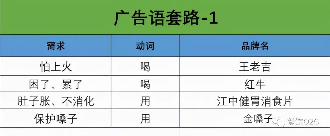 1、怕上火,喝王老吉:需求+动词+品牌名
